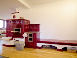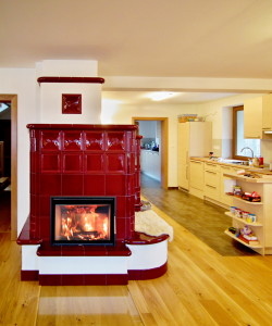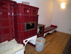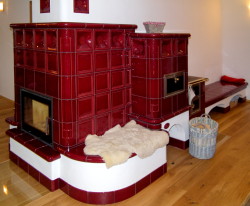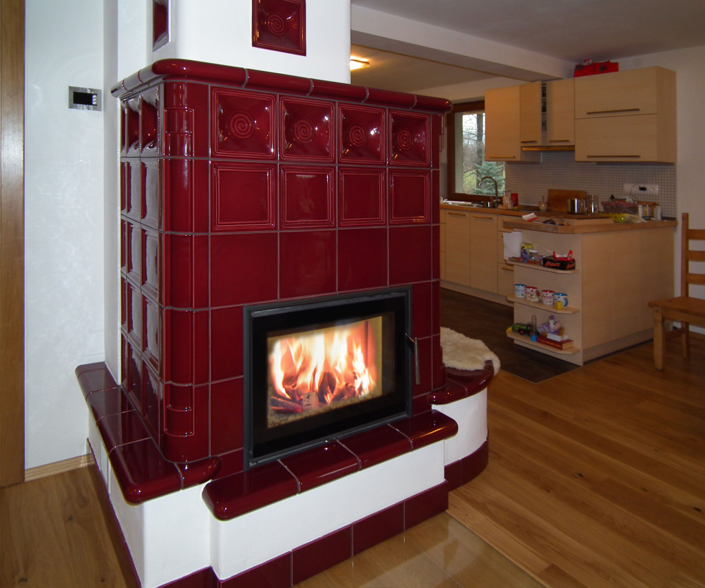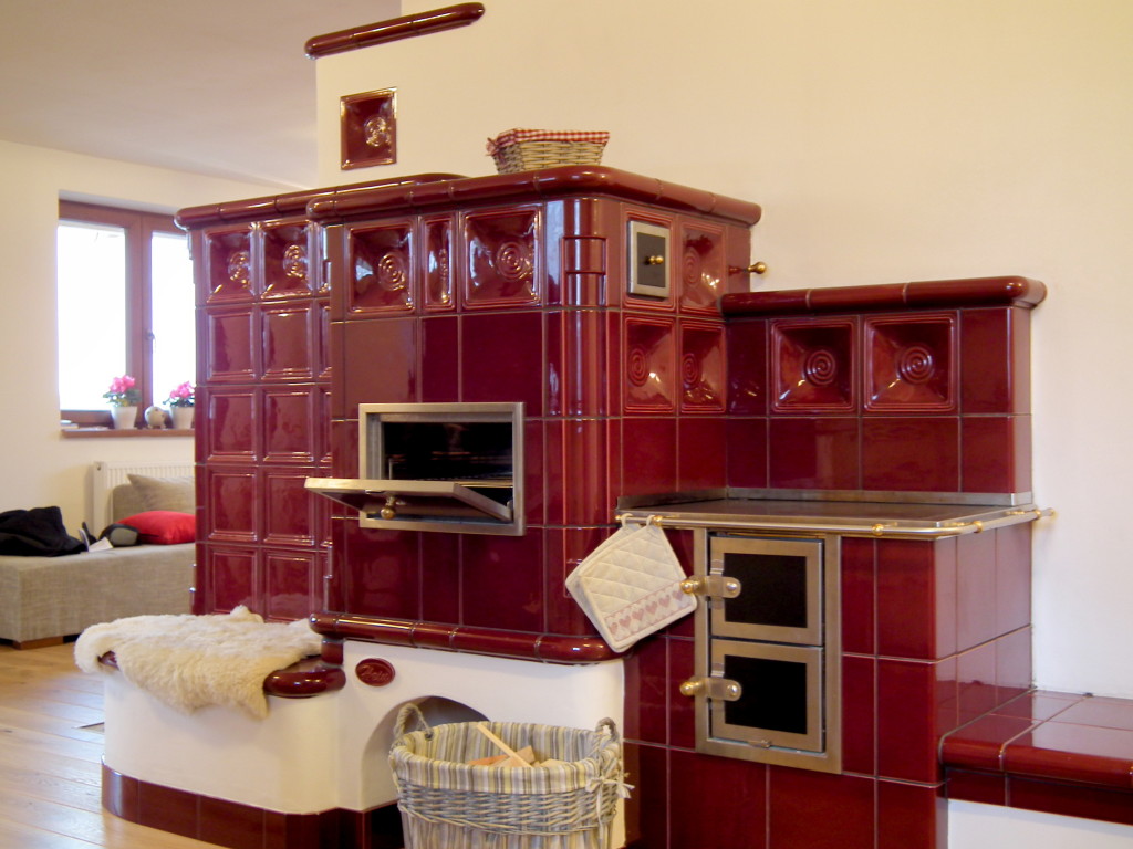 Kachlová kamna se dvěma  topeništi. Klasické sporákové kamna na vaření navazují na kamna pro vytápění domu. Hypokaustem (sálavá stěna) se vytápí horníhí patro domu. V těchto kamnech je osazena krbová vložka ROMOTOP KV025LN řízená automatickou regulací TIMPEX reg200 . Kachloví je od fy. Hein a sporákové kování je od fy. ŘEHULKA.