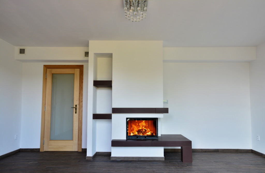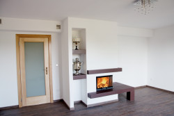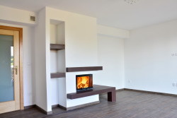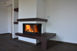 Horkovzdušný krb s designovou vložkou s rohovým prosklením a horním zdvihem ROMOTOP ANGLE řízená automatickou regulací TIMPEX . Obestavba z liaporových desek, rozvod horkého vzduchu do tří přilehlých místností, velkoplošná keramika HEIN.