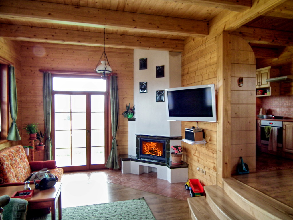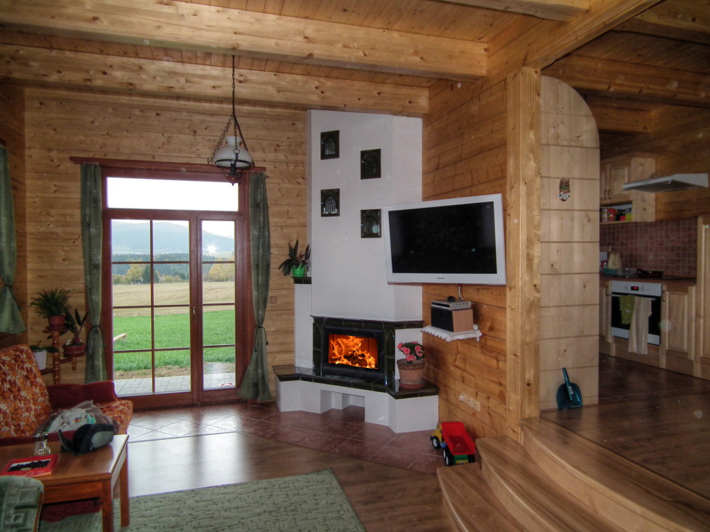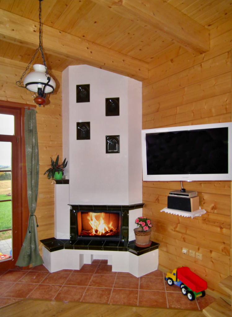 Horkovzdušný krb s krbovou vložkou BLANZEK , obestavba z liaporových desek. Římsy a větrací otvory kachloví HEIN.