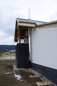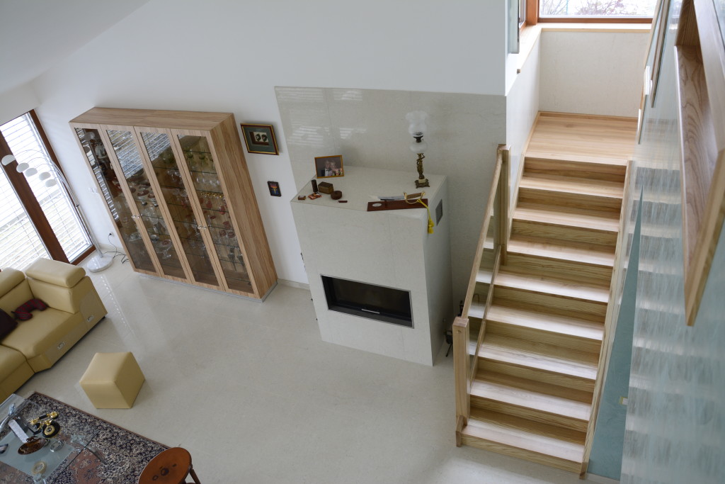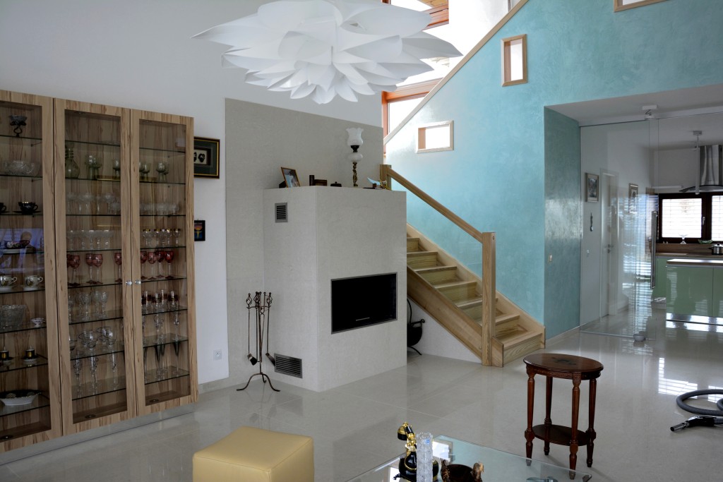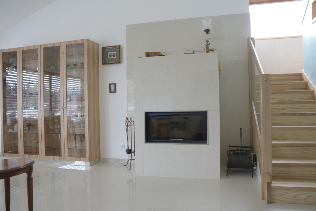 Popis krbu:    Krbová vložka s horním zdvihem dvířek Fy. ROMOTOP obestavba krbu z lehčeného betonu LIAPOR , obklad krbu je z velkoplošné keramické dlažby , komín je montovaný, tříplášťový nerezový dodaný a montovaný  naší firmou.