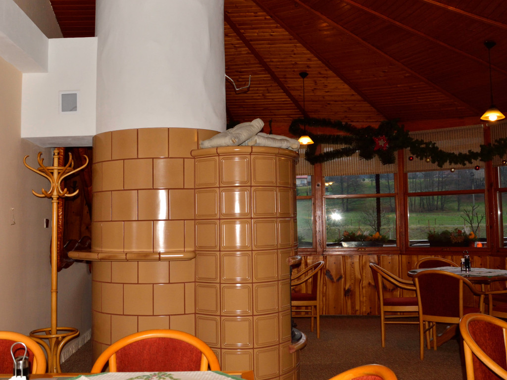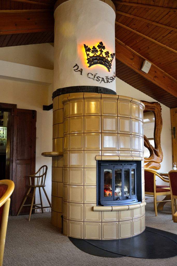 Lehká kachlová kamna s krbovou vložkou JOTUL a kachlovím Fy. Hein. Prohlídka možná 24hod. denně v nonstop motorestu \“Na Císařské\“ v Bystřici u Jablůnkova.