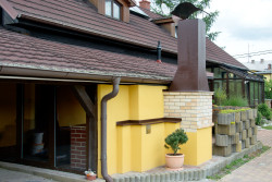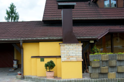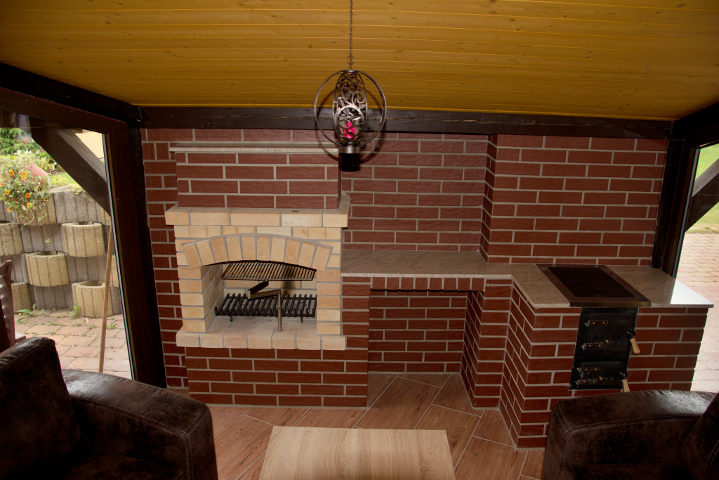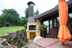 Venkovní dvojité ohniště s píckou. Vyzděné ohniště v zimní zahradě propojené s venkovním ohništěm. Spaliny z pícky jsou odváděny jedním komínem spolu s dvojitým ohništěm. Plotna s rámem a přikládací dvířka jsou vyrobeny Fy. ŘEHULKA.
